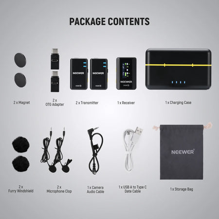 - Professional Wireless Lavalier Mic Set for Camera- NEEWER CM28 is a mini Wireless lapel Microphone Set with 2 transmitters (TX) and 1 receiver (RX). They can operate for 9 hours (TX) and 8 hours (RX) once fully charged, ideal for extended outdoor audio recording, podcasting, and live streaming. Charge them twice in just 1.5 hours each time with the included protective charging case.